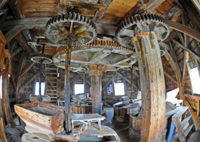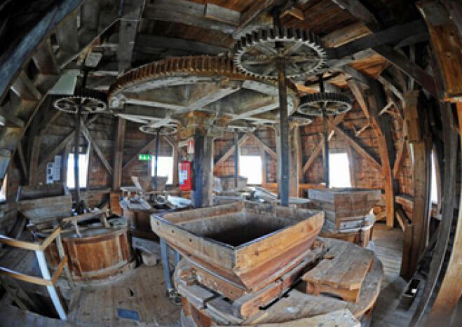 När Du tittar på kvarnen, lägg då speciellt märke till att kugghjul, paternosterverk och matningsskruvar är snidade i trä.